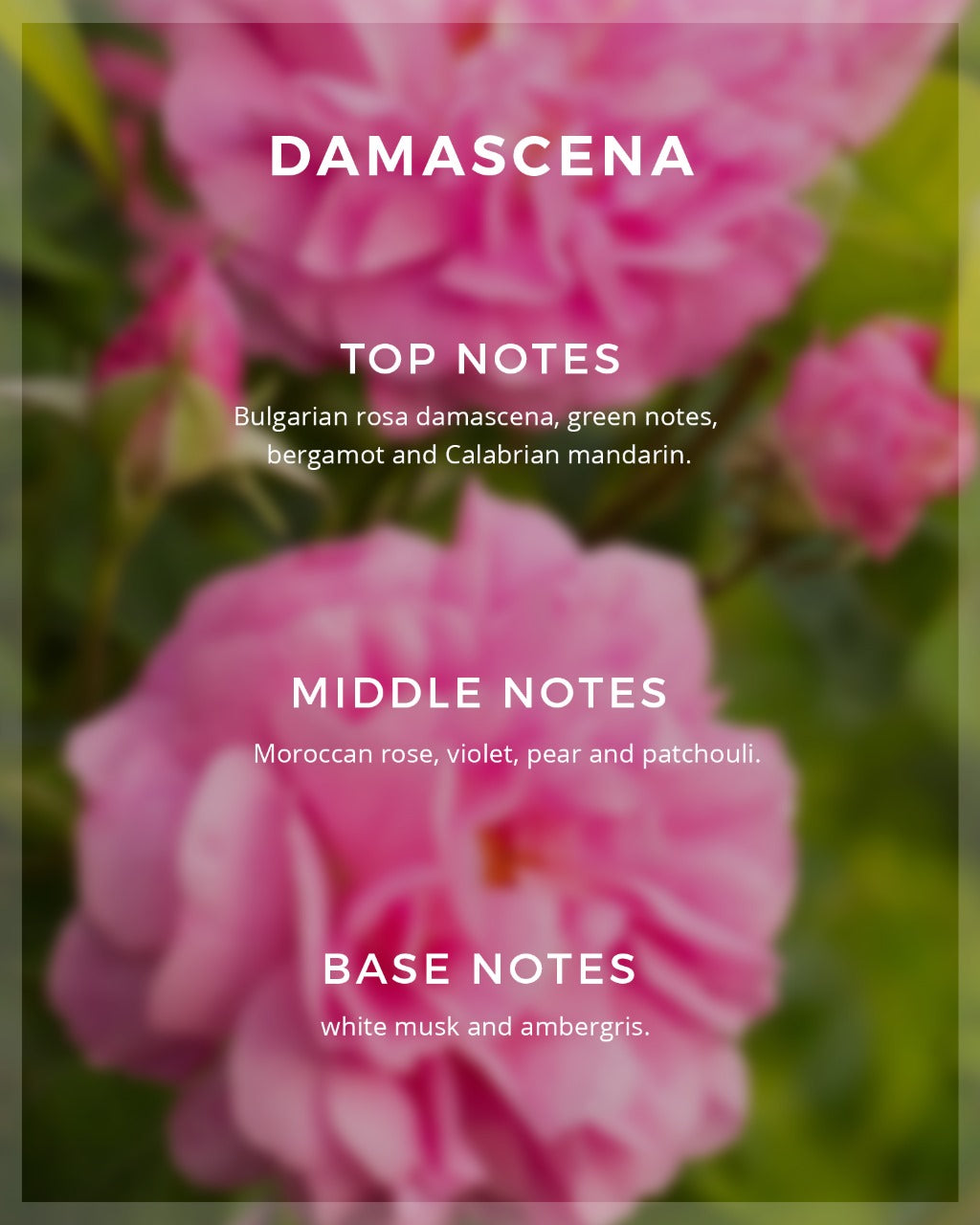 At the top of Damascena, the Bulgarian Rosa Damascena and green notes blend with Bergamot and Calabrian Mandarin to create the perfect balance of freshness and femininity. As the fragrance develops, a luxurious heart of Moroccan Rose, Violet, Pear, and soft Patchouli enriches the scent with a floral bouquet that is simply unforgettable. Finally, a warm base of White Musk and luxurious Ambergris rounds out the fragrance leaving a lasting impression that will make you feel elegant and sophisticated.